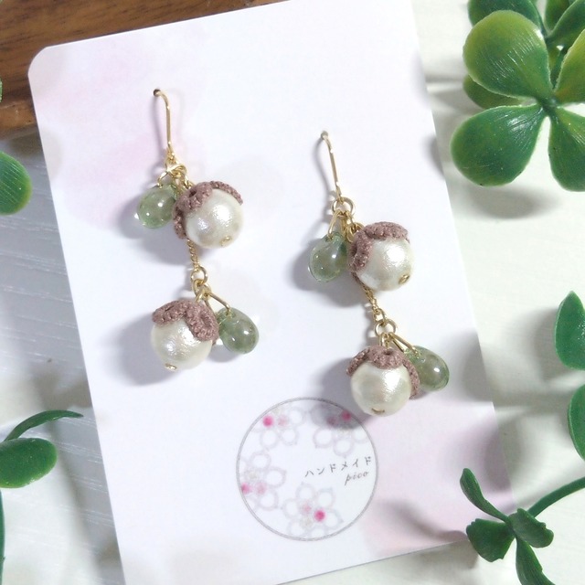 ころんと並んだどんぐりが耳元でゆらゆら揺れる 「コロコロどんぐりピアス(イヤリング)」です タティングレースで編んだ帽子とコットンパールを組み合わせて、 まるで本物のどんぐりのような愛らしい雰囲気に仕上げました 横には黄緑のチェコビーズを添えて、葉っぱのような瑞々しさをプラス 2粒のどんぐりがゆらゆら揺れるたびに、 秋のお散歩気分を楽しめるようなデザインです ┈┈┈┈┈┈┈ ❁ ❁ ❁ ┈┈┈┈┈┈┈┈ 【サイズ】 全長:約4.5cm ┈┈┈┈┈┈┈ ❁ ❁ ❁ ┈┈┈┈┈┈┈┈ 【主な材料】 ・レース糸 ・コットンパール ・チェコビーズ ・金具 ┈┈┈┈┈┈┈ ❁ ❁ ❁ ┈┈┈┈┈┈┈┈ 【金具】 ①ピアス(真鍮)フック ②ピアス(真鍮)ポスト ③イヤリング(ネジバネ) ④ピアス(樹脂)フック ⑤ノンホールピアス ⚠ご注文時にご希望の金具をおっしゃってください ご希望がない場合は①ピアス(真鍮)フックで発送させていただきます ┈┈┈┈┈┈┈ ❁ ❁ ❁ ┈┈┈┈┈┈┈┈