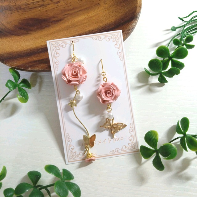 綺麗に咲いてる薔薇に 蝶々(バタフライ)がヒラヒラと遊びにきてるのを イメージして作ったピアス(イヤリング)です(*^-^*) 薔薇(rose)は紙で作るバラ「ロザフィ」で1つ1つ薔薇を作り 立体的なモチーフにしてあるので どの角度から見ても薔薇が綺麗に咲いてます.◌܀ 左右で違う蝶々(バタフライ)のパーツを合わせて ゆらゆら揺れて可愛い感じに仕上げました おでかけの時に耳元を華やかにしてくれます♪ 【サイズ】 全長:約9cm(長い方) 約6cm(短い方) 【金具】 ①ピアス(真鍮)フック ②ピアス(真鍮)ポスト ③イヤリング(真鍮) ④ピアス(樹脂)フック ⑤ノンホールピアス 金具はお選び頂けますので ご購入時にご希望の金具をおっしゃって下さい