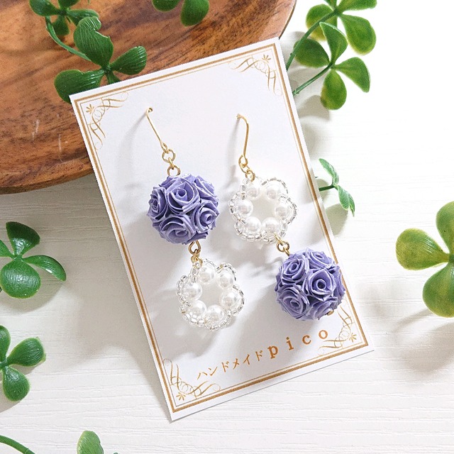 紙で作るバラ「ロザフィ」で作ったバラの球体モチーフと 樹脂パールと丸小ビーズでつくったお花モチーフを 組み合わせたピアス(イヤリング) お花好きさんにオススメしたい お花&お花の可愛いアクセサリー(*^-^*) 左右でアシンメトリーになっているので 楽しんで使用して頂けたら嬉しいです♪ パステルカラーの薄紫(すみれ色)で お顔まわりを優しい雰囲気にしてくれます 【金具】 ①ピアス(真鍮)フック ②ピアス(真鍮)ポスト ③イヤリング(真鍮)ネジバネ ④ピアス(樹脂)フック ⑤ノンホールピアス 金具はお選び頂けますので ご注文時にご希望の金具をお選びください