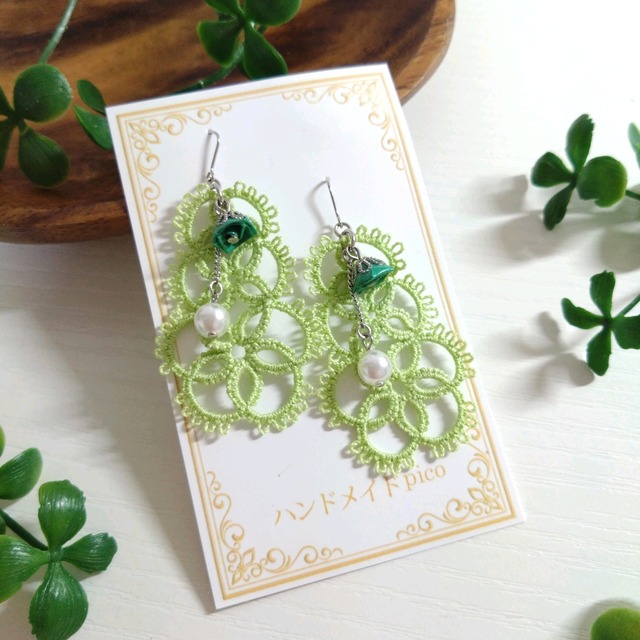 耳元から、雫が滴り落ちる様な感じを出したピアス(イヤリング) 水色のレース糸を使用し、タティングレースで雫モチーフを編んでます 雫モチーフに紙で作るバラ「ロザフィ」と樹脂パールを合わせて揺れる様にしました 【サイズ】 ・雫モチーフ:約4.5cm ・全長:約6cm 【主材料】 ・レース糸 ・ロザフィ専用ペーパー ・樹脂パール ・金具 【金具】 ①ピアス(真鍮)フック ②ピアス(真鍮)ポスト ③イヤリング(真鍮) ④ピアス(樹脂)フック ⑤ノンホールピアス 金具はお選び頂けますので ご注文時にご希望の金具の番号をおっしゃって下さい