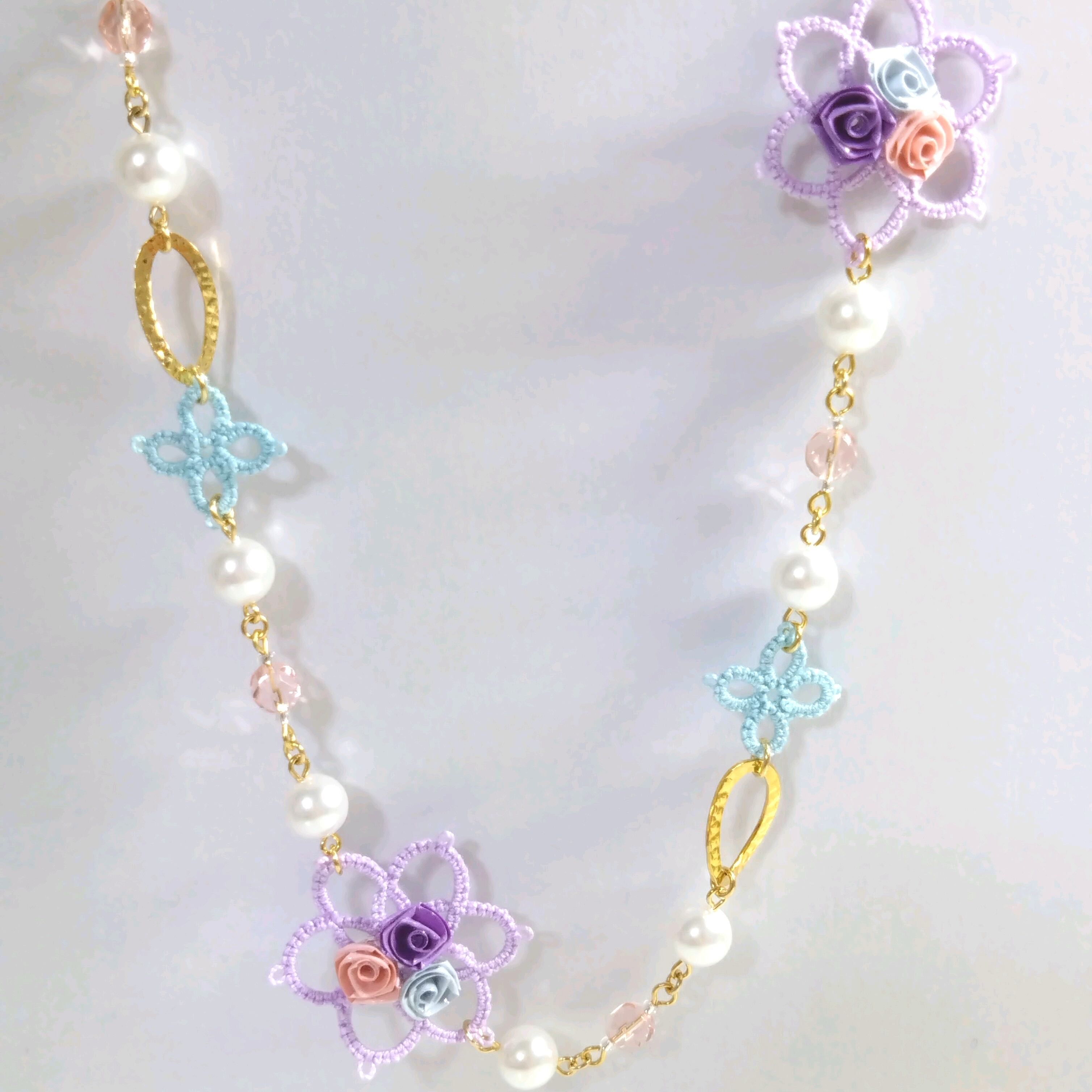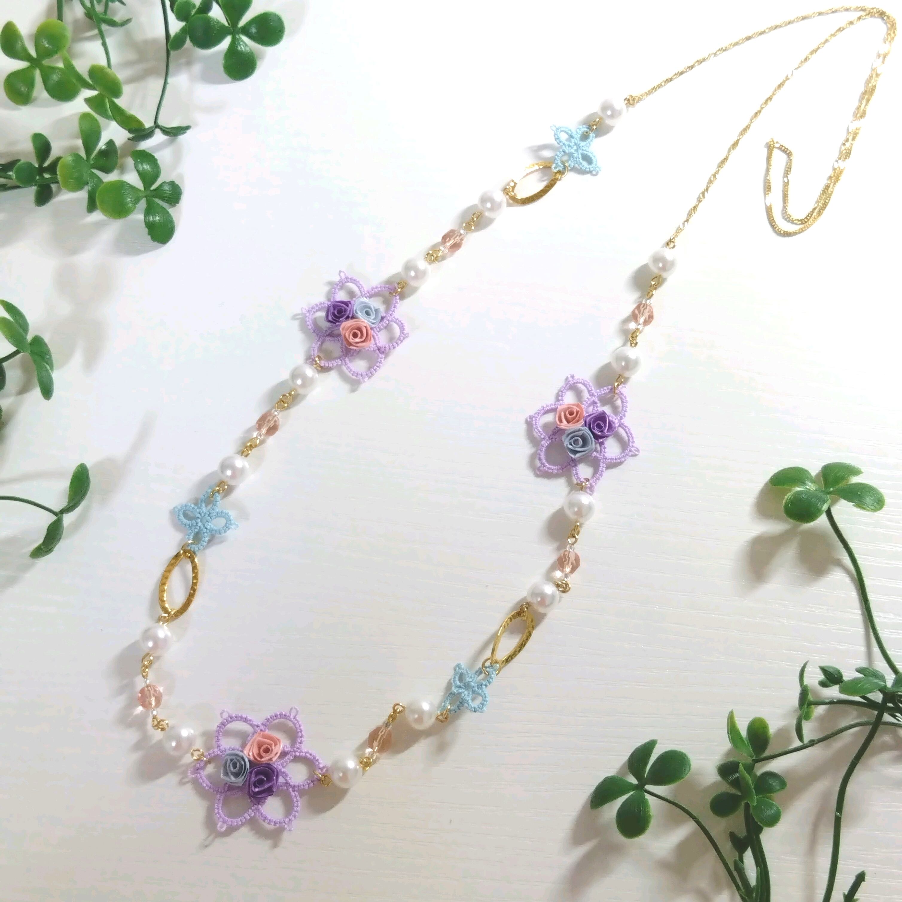 レースのお花モチーフにバラを咲かせたロングネックレスになります