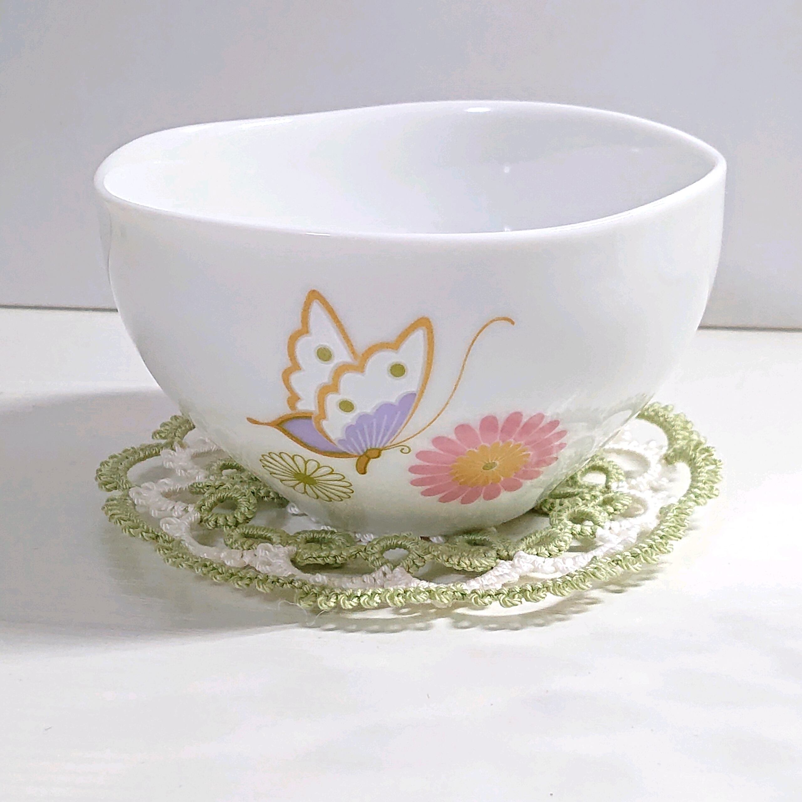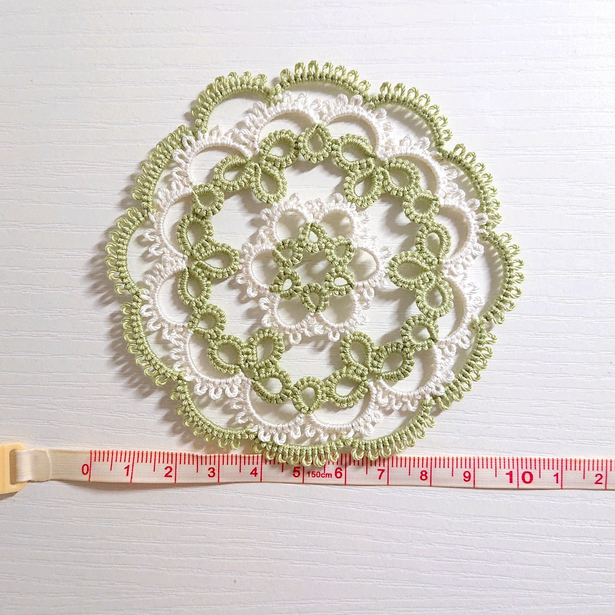 そんな、癒し効果のあるグリーンとオフホワイトのレース糸を使用し、タティングレースでコースターを編みました