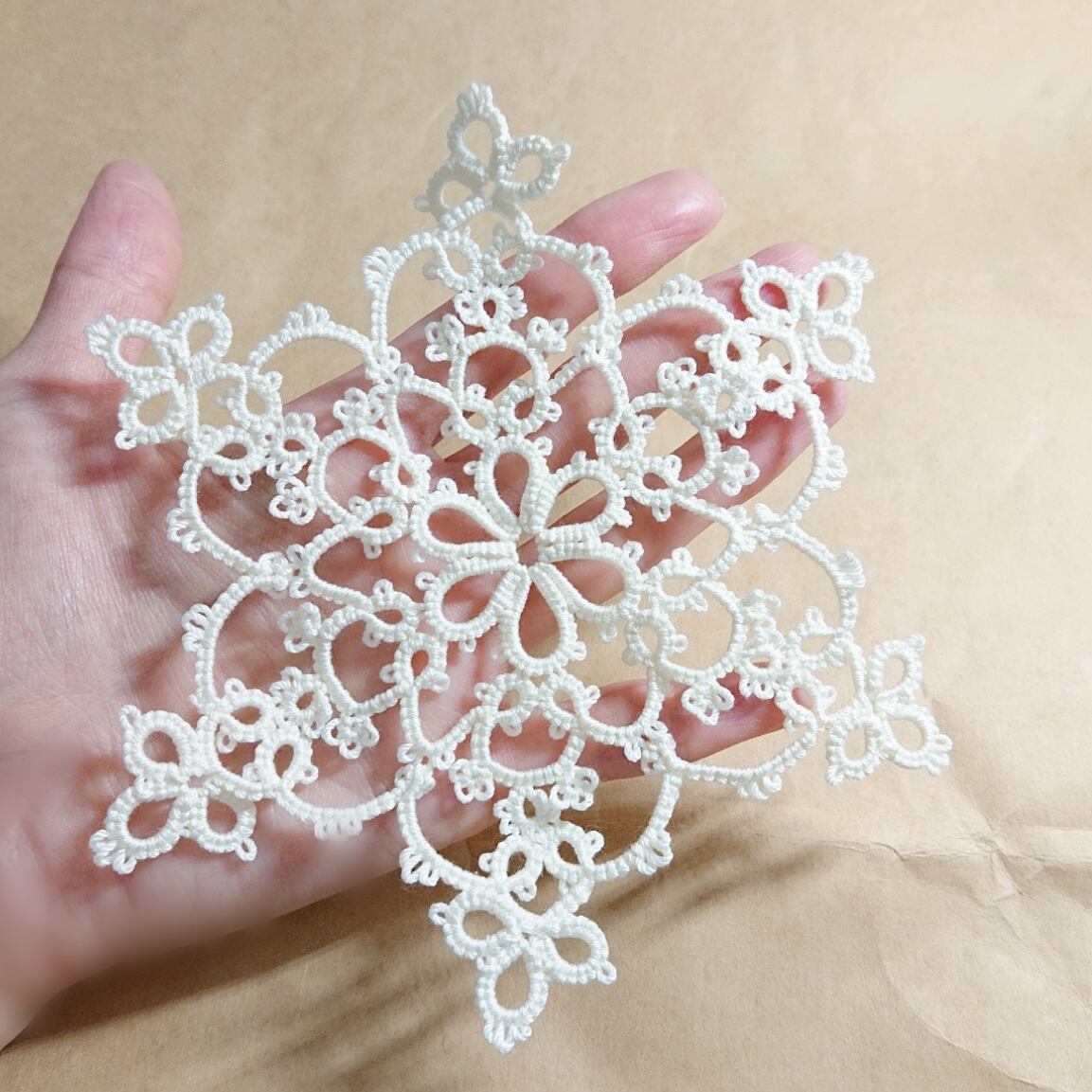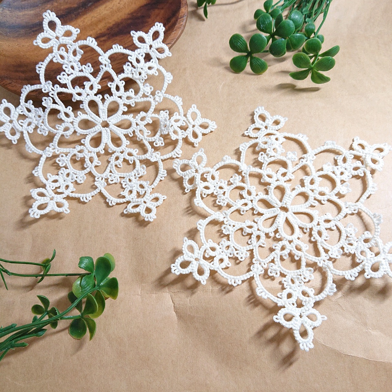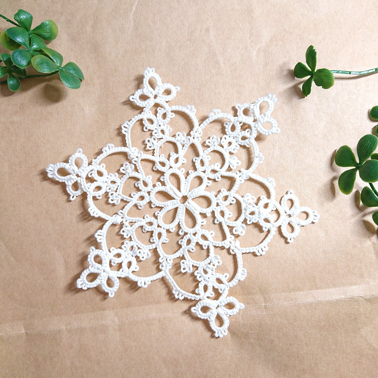 ふわっと舞い降りた雪が、光に当たってキラキラと輝く瞬間をタティングレースで丁寧に表現した