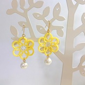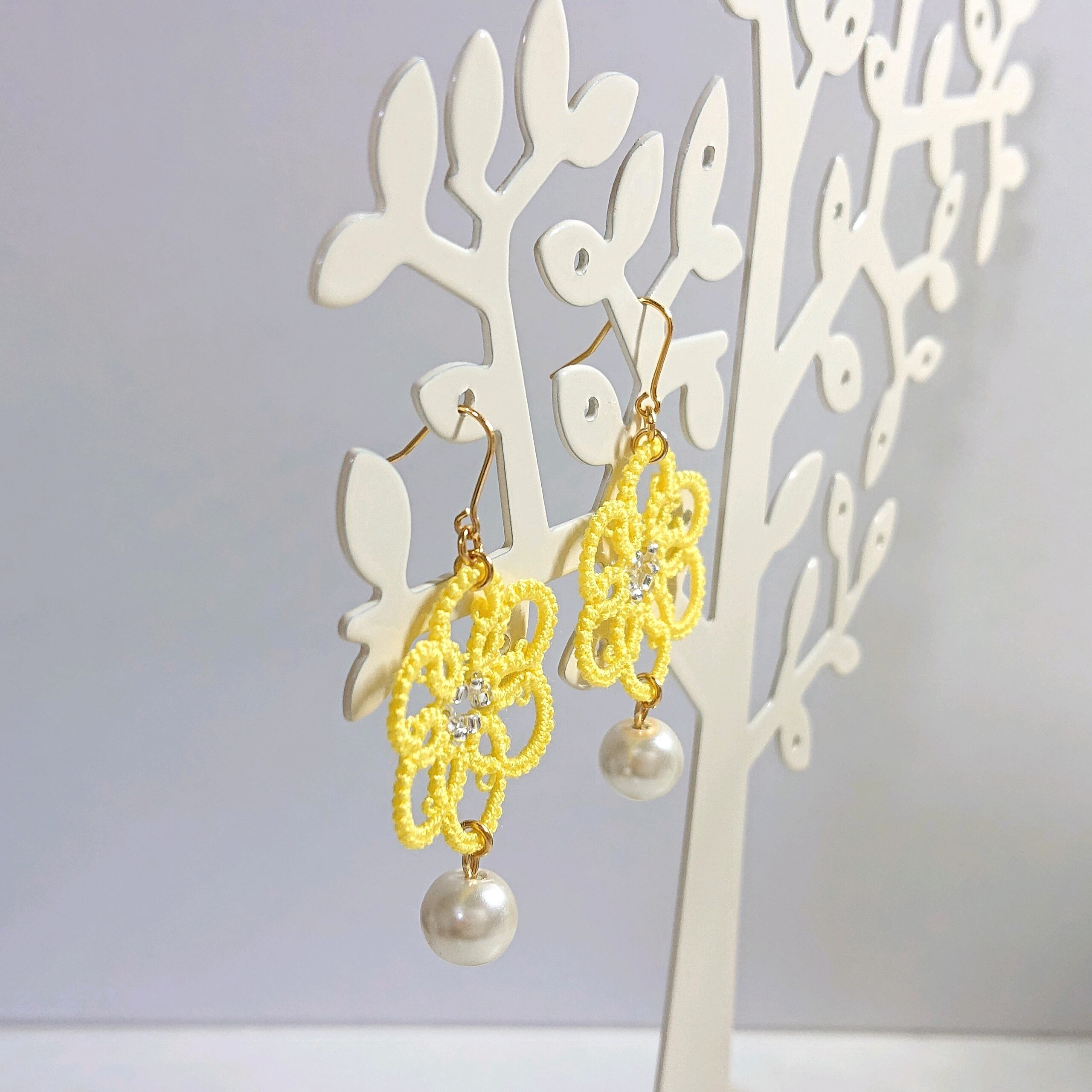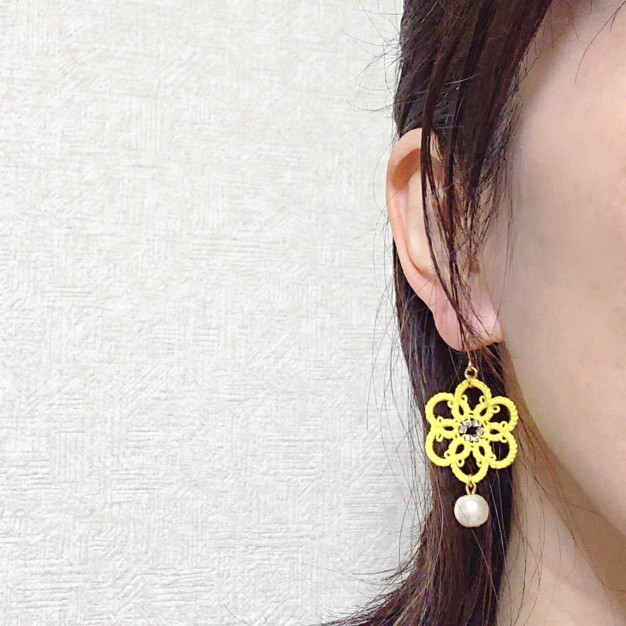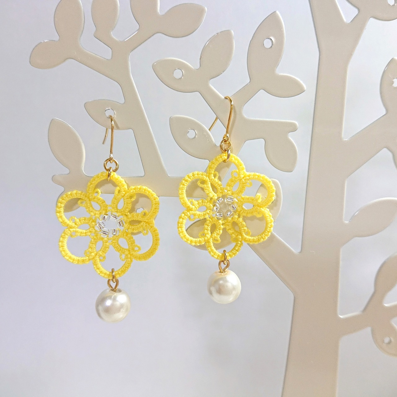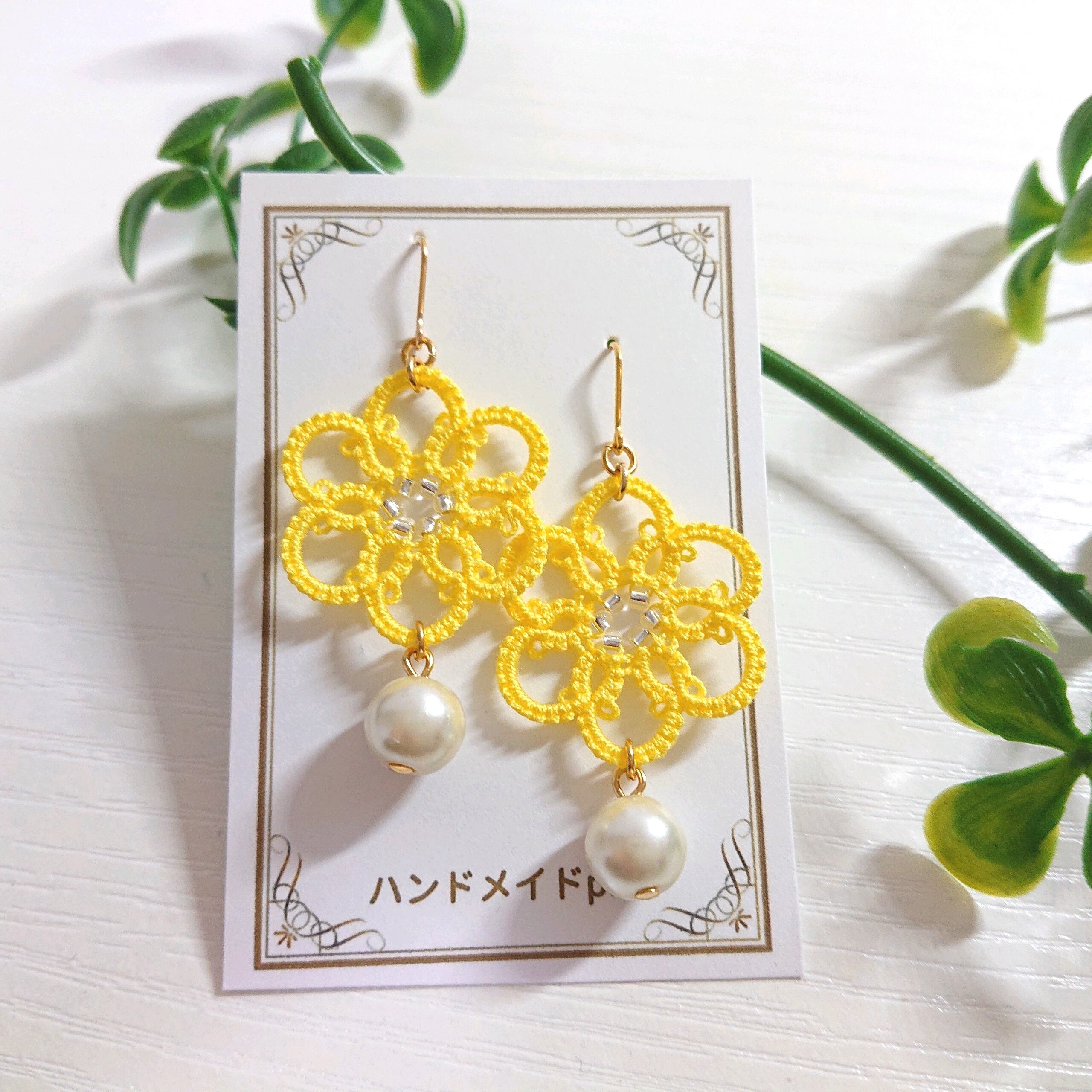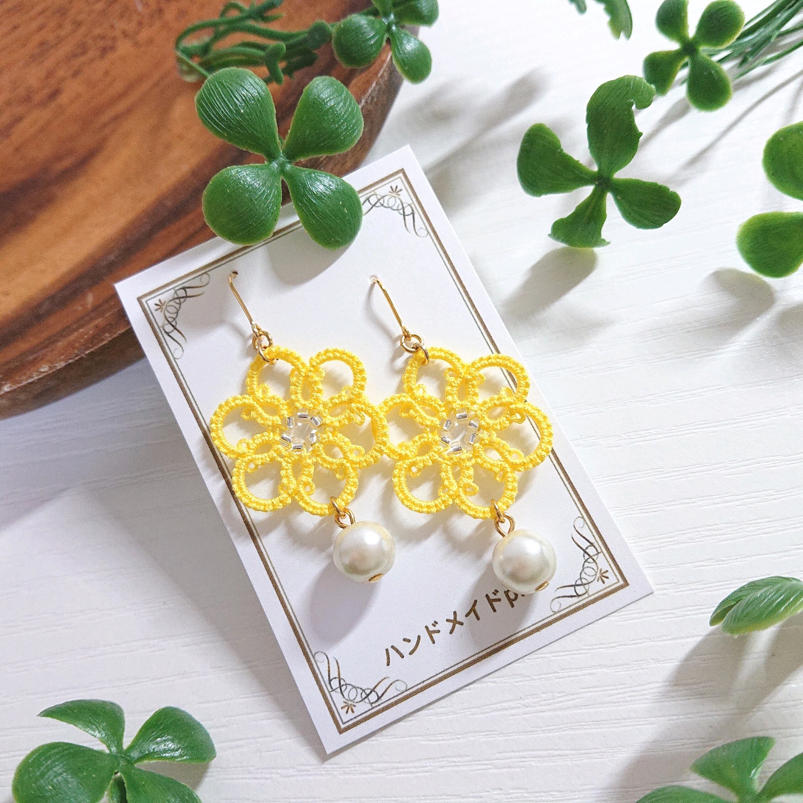 鮮やかな黄色のお花に樹脂パールを揺らして可愛いピアス(イヤリング)にしました