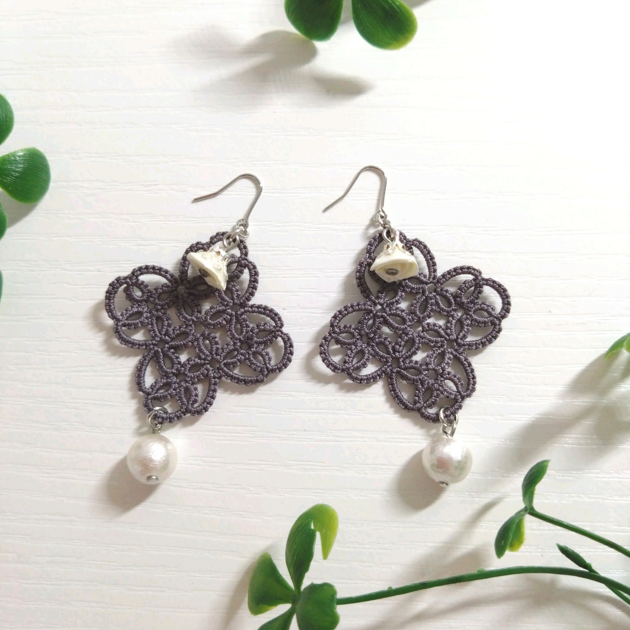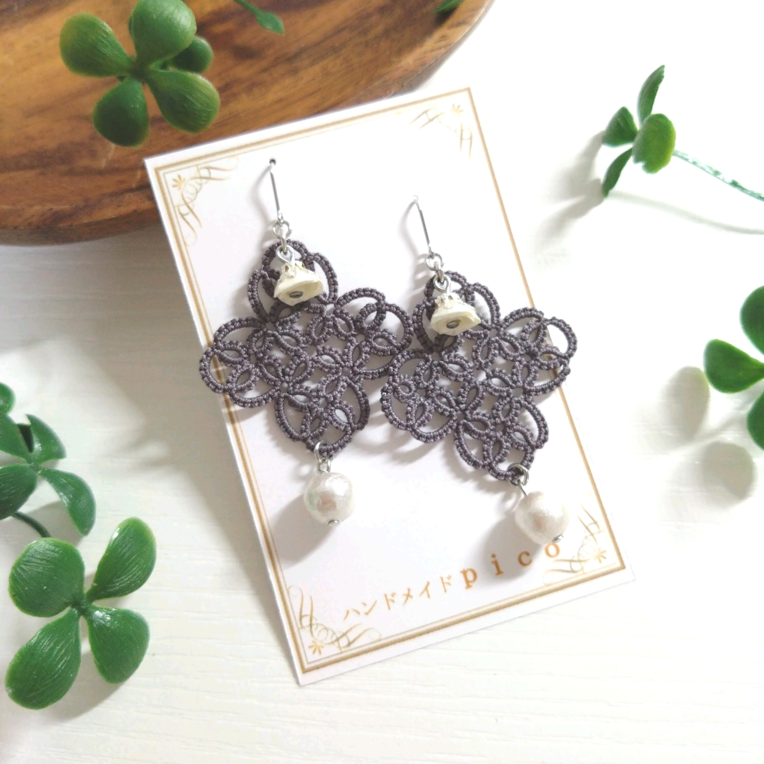 四つ葉&ローズピアス(イヤリング)グレー