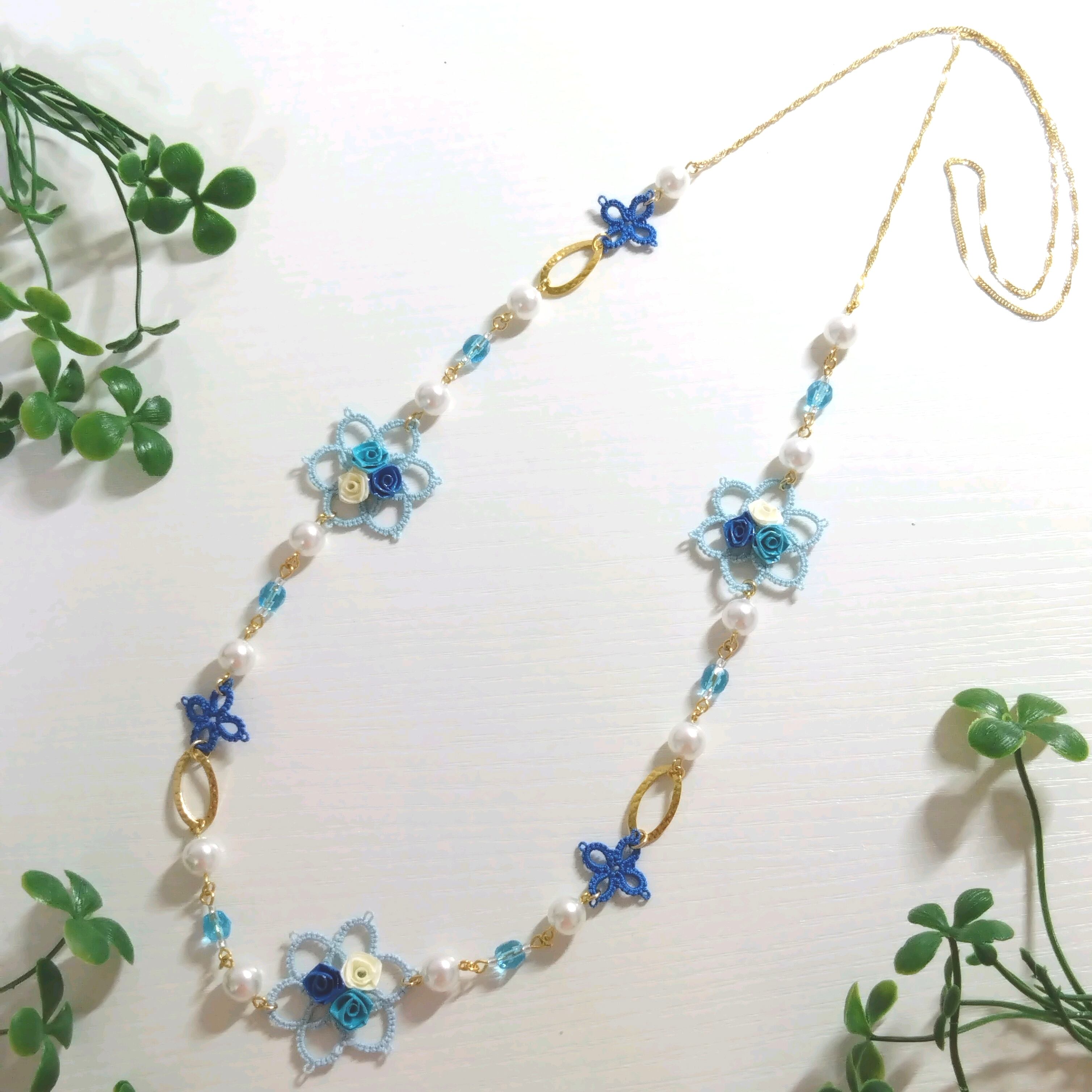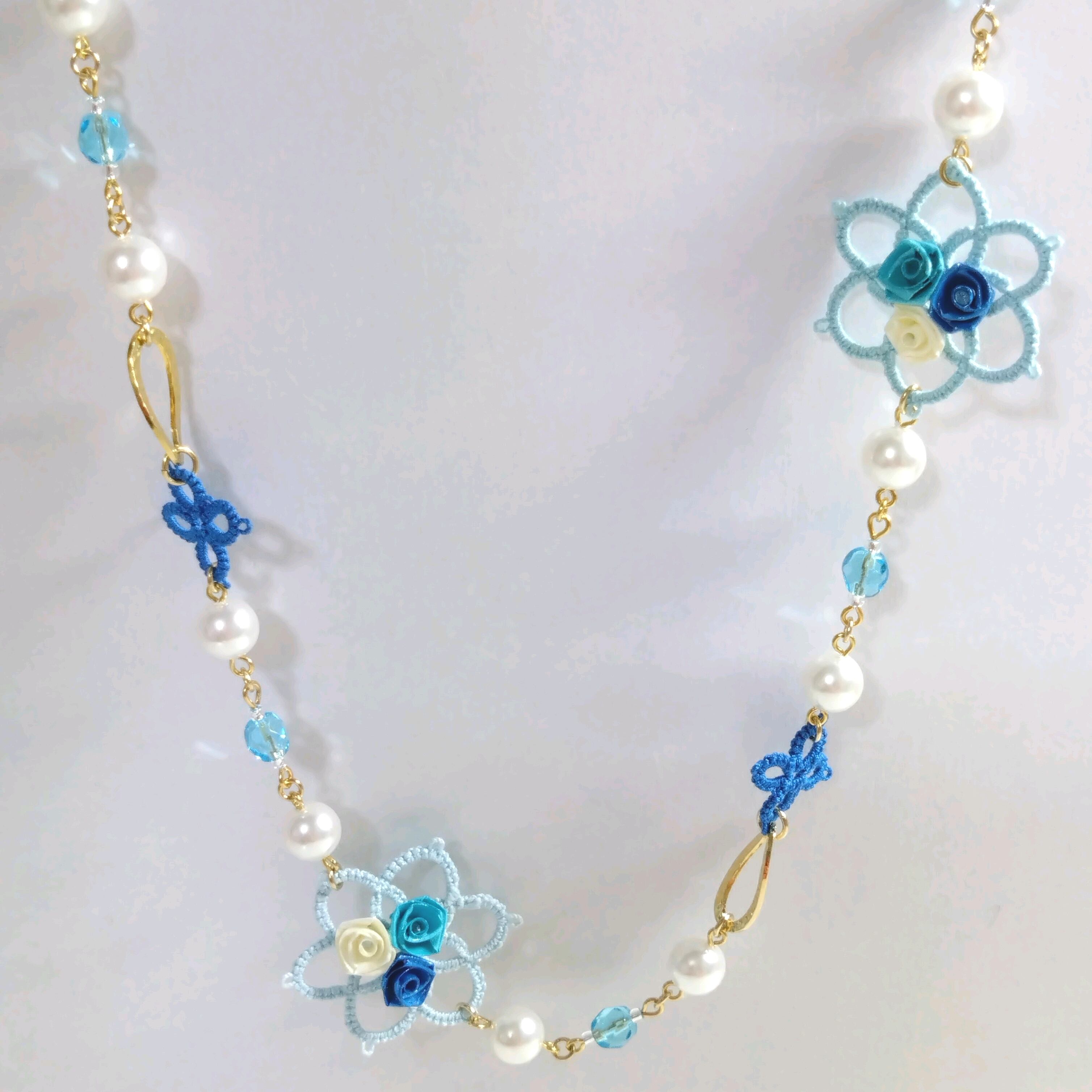 レースのお花モチーフにバラを咲かせたロングネックレスになります