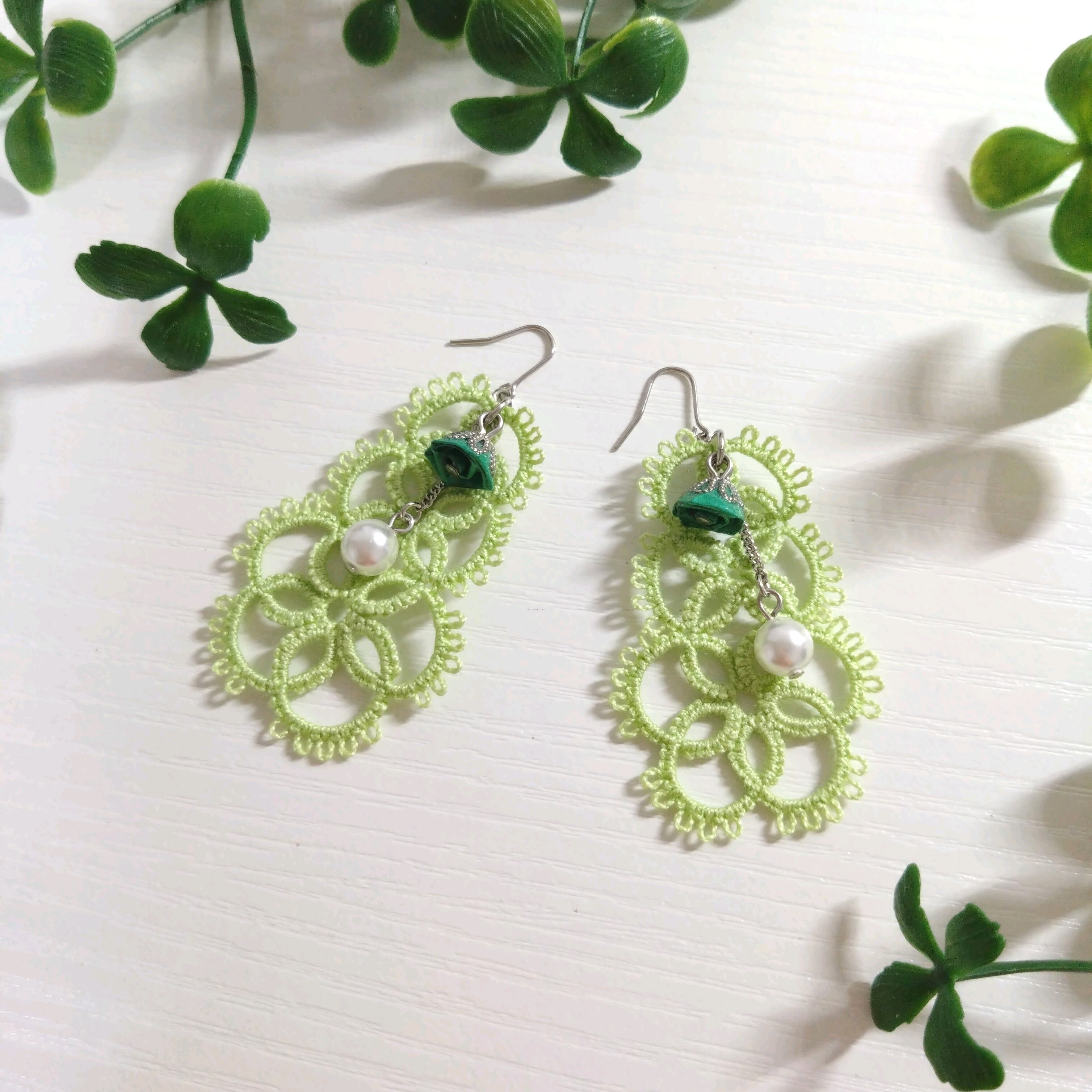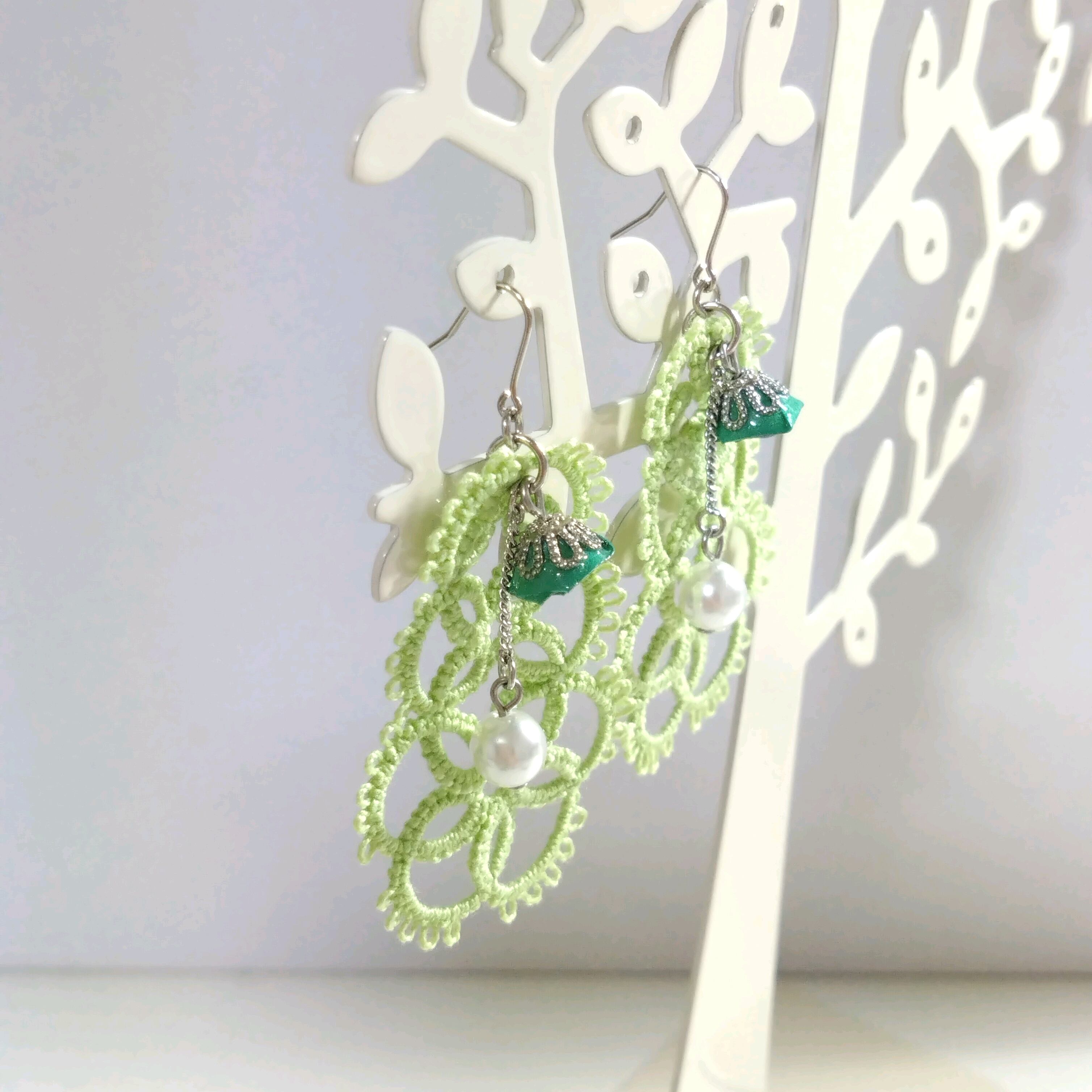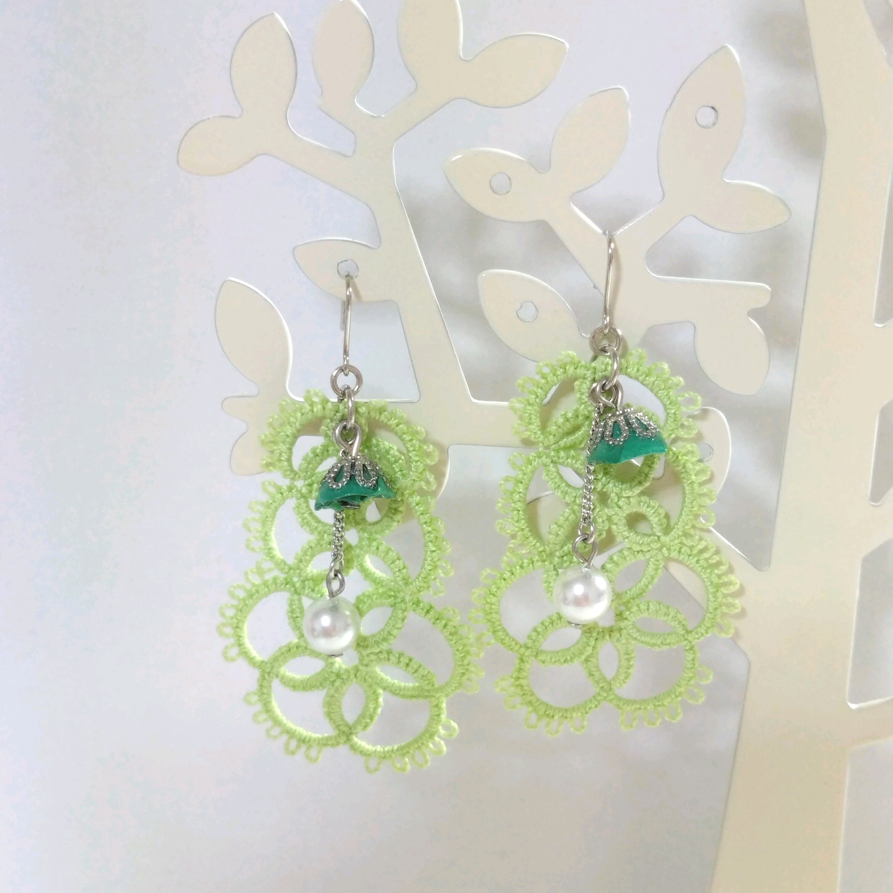 水色のレース糸を使用し、タティングレースで雫モチーフを編んでます